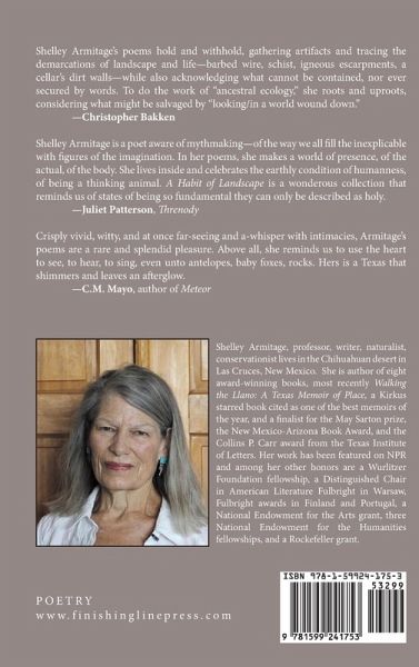 A Habit of Landscape celebrates the convergent meanings of habit and habitat. each sharing the words "to dwell." These poems hold sensate moments-family experiences, inner revelations, transformative places. A realized kinship between the human and natural worlds signals the inclusiveness of place. Not something "out there," this shared space-personal or global- often surprises in the poem's turn. Like flash narratives these poems contain worlds in the vibrating fabric of the instant- forgotten, dismissed, previously unseen. Whether an elegy for a brother, an encounter with a pronghorn, or the whispers surrounding adoption, these lyric pieces speak to the sacrality of the moment.
