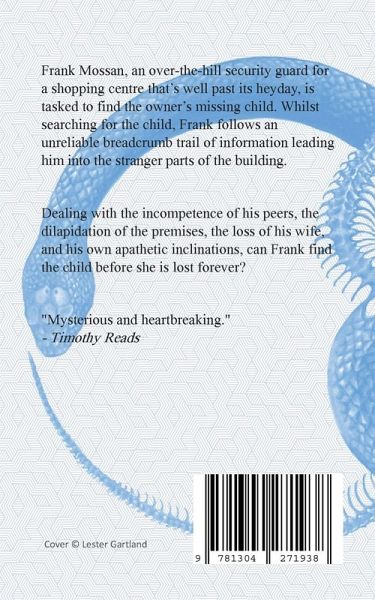 Frank Mossan, an over-the-hill security guard for a shopping centre that's well past its heyday, is tasked to find the owner's missing child. Whilst searching for the child, Frank follows an unreliable breadcrumb trail of information leading him into the stranger parts of the building. Dealing with the incompetence of his peers, the dilapidation of the premises, the loss of his wife, and his own apathetic inclinations, can Frank find the child before she is lost forever? "Mysterious and heartbreaking." - Timothy Reads "Dizzyingly good." - Innad