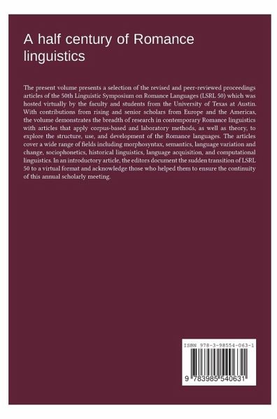 The present volume presents a selection of the revised and peer-reviewed proceedings articles of the 50th Linguistic Symposium on Romance Languages (LSRL 50) which was hosted virtually by the faculty and students from the University of Texas at Austin. With contributions from rising and senior scholars from Europe and the Americas, the volume demonstrates the breadth of research in contemporary Romance linguistics with articles that apply corpus-based and laboratory methods, as well as theory, to explore the structure, use, and development of the Romance languages. The articles cover a wide range of fields including morphosyntax, semantics, language variation and change, sociophonetics, historical linguistics, language acquisition, and computational linguistics. In an introductory article, the editors document the sudden transition of LSRL 50 to a virtual format and acknowledge those who helped them to ensure the continuity of this annual scholarly meeting.