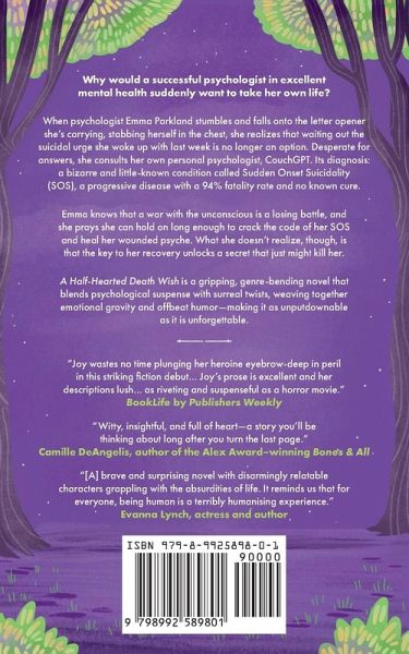 Why would a successful psychologist in excellent mental health suddenly want to take her own life? When psychologist Emma Parkland stumbles and falls onto the letter opener she's carrying, stabbing herself in the chest, she realizes that waiting out the suicidal urge she woke up with last week is no longer an option. Desperate for answers, she consults her own personal psychologist, CouchGPT. Its diagnosis: a bizarre and little-known condition called Sudden Onset Suicidality (SOS), a progressive disease with a 94% fatality rate and no known cure. If Emma can't find a way to heal her SOS, she won't just lose her life-she'll destroy the lives of everyone who depends on her. Like Gregory, owner of Out-of-the-Box Custom Coffins who attends her Mortal Wounds support group to cope with his debilitating fear of death. And her couples clients, Jenna and Alexander, whose marriage is buckling under the strain of Alexander's ADHD and "little messes everywhere." Emma knows that a war with the unconscious is a losing battle, and she prays she can hold on long enough to crack the code of her SOS and heal her wounded psyche. What she doesn't realize, though, is that the key to her recovery unlocks a secret that just might kill her. A Half-Hearted Death Wish is a gripping, genre-bending novel that blends psychological suspense with surreal twists and absurdist elements, weaving together emotional gravity and offbeat humor. With its unpredictable turns, endearing characters, and thought-provoking insights, it takes readers on a transformative journey-making it as unputdownable as it is unforgettable.