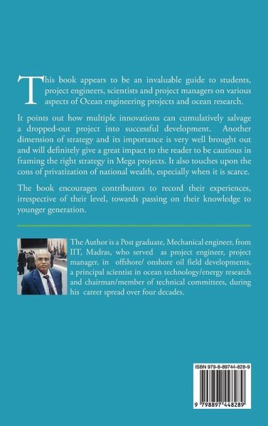 This Overview book appears to be an invaluable guide to students, project engineers, scientists and project managers on various aspects of Ocean engineering projects and ocean research. It points out how multiple innovations can cumulatively salvage a dropped out project into successful development. Another dimension of strategy and its importance is very well brought out and will definitely give a great impact to the reader to be cautious in framing the right strategy in Mega projects. It also touches upon the cons of privatization of national wealth, especially when it is scarce. The book encourages contributors to record their experiences, irrespective of their level, towards passing on their knowledge to younger generation.