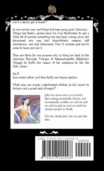 Can't a demon get a break? A new school year, and things had been going good. Seriously. Things had finally calmed down for Eve McAllister to get a little bit of normal--something she had been craving since she discovered she was half blood-thristy vampire, half mischievous imp last Halloween. Then 3 witches just had to come to town. They are there for one purpose only: to bring her back to the notorious Bermuda Triangle of Massachusetts (Middleton Village) to fulfill the reason of her existence--to kill the Holy Seven. As if. Eve would rather surf than fulfill any bloody destiny. What else can sneaky underhanded witches do but resort to trickery and a great deal of magic?