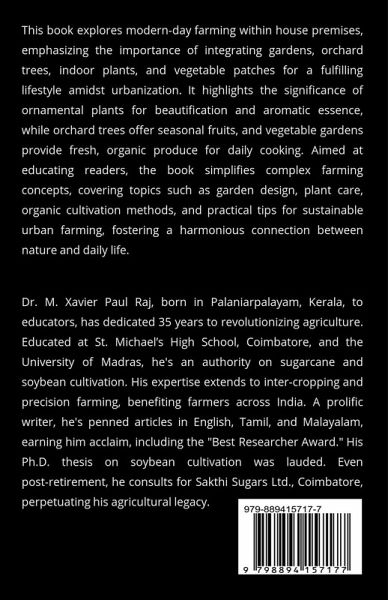 This book explores modern-day farming within house premises, emphasizing the importance of integrating gardens, orchard trees, indoor plants, and vegetable patches for a fulfilling lifestyle amidst urbanization. It highlights the significance of ornamental plants for beautification and aromatic essence, while orchard trees offer seasonal fruits, and vegetable gardens provide fresh, organic produce for daily cooking. Aimed at educating readers, the book simplifies complex farming concepts, covering topics such as garden design, plant care, organic cultivation methods, and practical tips for sustainable urban farming, fostering a harmonious connection between nature and daily life.