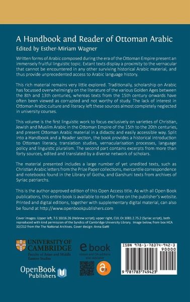 Written forms of Arabic composed during the era of the Ottoman Empire present an immensely fruitful linguistic topic. Extant texts display a proximity to the vernacular that cannot be encountered in any other surviving historical Arabic material, and thus provide unprecedented access to Arabic language history. This rich material remains very little explored. Traditionally, scholarship on Arabic has focussed overwhelmingly on the literature of the various Golden Ages between the 8th and 13th centuries, whereas texts from the 15th century onwards have often been viewed as corrupted and not worthy of study. The lack of interest in Ottoman Arabic culture and literacy left these sources almost completely neglected in university courses. This volume is the first linguistic work to focus exclusively on varieties of Christian, Jewish and Muslim Arabic in the Ottoman Empire of the 15th to the 20th centuries, and present Ottoman Arabic material in a didactic and easily accessible way. Split into a Handbook and a Reader section, the book provides a historical introduction to Ottoman literacy, translation studies, vernacularisation processes, language policy and linguistic pluralism. The second part contains excerpts from more than forty sources, edited and translated by a diverse network of scholars. The material presented includes a large number of yet unedited texts, such as Christian Arabic letters from the Prize Paper collections, mercantile correspondence and notebooks found in the Library of Gotha, and Garshuni texts from archives of Syriac patriarchs.