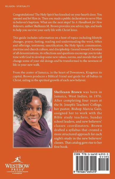 Congratulations! The Holy Spirit has knocked on your heart's door. You opened and let Him in. Then you made a public declaration to serve Him in believer's baptism. What are the next steps? In A Handbook for New Believers, author Shelleann M. Brown provides you advice, tips, and tools to help you survive your early life with Christ Jesus. This guide includes information on a host of topics including lifestyle changes, prayer, fasting, reading and understanding the word, tithes and offerings, testimony, sanctification, the Holy Spirit, communion, doctrine and church culture, and discipleship. Geared toward Christian of all denominations, its reflections and questions encourage you to take time with God to develop some new values, norms, and morals that will change some of your old doings and be transformed to the newness of life in your new walk. From the center of Jamaica, in the heart of Downtown, Kingston its capital, Brown produces a Biblical friend and guide for all babies in Christ, aiding in the spiritual growth of each new believer.