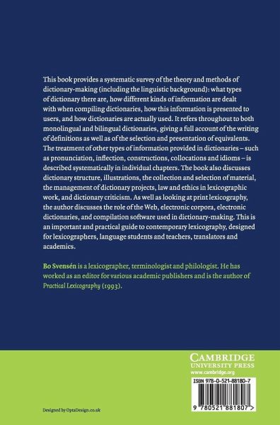 This book provides a systematic survey of the theory and methods of dictionary-making: what types of dictionary there are, how different kinds of information are dealt with when compiling dictionaries, how this information is presented to users, and how dictionaries are actually used. It refers throughout to both monolingual and bilingual dictionaries, giving a full account of the writing of definitions as well as of the selection and presentation of equivalents. The treatment of other types of information provided in dictionaries is described systematically in individual chapters. The book also discusses dictionary structure, illustrations, the collection and selection of material, the management of dictionary projects, law and ethics in lexicographic work, and dictionary criticism. As well as looking at print lexicography, the author discusses the role of the Web, electronic corpora, electronic dictionaries, and compilation software used in dictionary-making. This is an important and practical guide to contemporary lexicography, designed for lexicographers, language students and teachers, translators and academics.