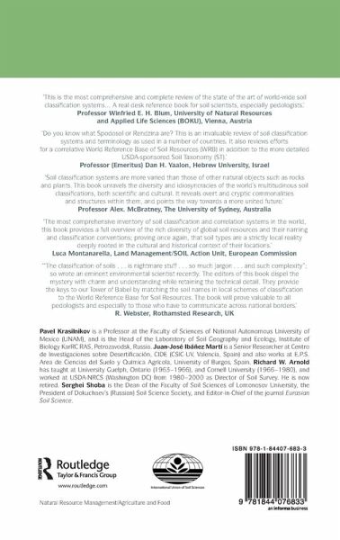Pavel Krasilnikov is a Professor at the Faculty of Sciences of National Autonomous University of Mexico (UNAM), and is the Head of the Laboratory of Soil Geography and Ecology, Institute of Biology KarRC RAS, Petrozavodsk, Russia. Juan-Jos Ibáñez Marti is a Senior Researcher at Centro de Investigaciones sobre Desertificaci n, CIDE (CSIC-UV, Valencia, Spain) and also works at E.P.S. Area de Ciencias del Suelo y Qu mica Agr cola, University of Burgos, Spain. Richard W. Arnold has taught at University Guelph, Ontario (1963-1966), and Cornell University (1966-1980), and worked at USDA -NRCS (Washington DC) from 1980-2000 as Director of Soil Survey. He is now retired. Serghei Shoba is the Dean of the Faculty of Soil Sciences of Lomonosov University, the President of Dokuchaev's (Russian) Soil Science Society, and Editor-in-Chief of the journal 'Eurasian Soil Science'. Additional Contributors: Chapter 9 written together with Dr. P. Schad Chapter 16 with Professor E. Micheli Chapter 26 with Dr. A. Hernández Jiménez Part III co-written by J. Tabor