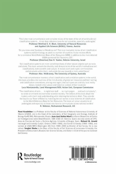 Pavel Krasilnikov is a Professor at the Faculty of Sciences of National Autonomous University of Mexico (UNAM), and is the Head of the Laboratory of Soil Geography and Ecology, Institute of Biology KarRC RAS, Petrozavodsk, Russia. Juan-Jose Ibanez Marti is a Senior Researcher at Centro de Investigaciones sobre Desertificacion, CIDE (CSIC-UV, Valencia, Spain) and also works at E.P.S. Area de Ciencias del Suelo y Quimica Agricola, University of Burgos, Spain. Richard W. Arnold has taught at University Guelph, Ontario (1963-1966), and Cornell University (1966-1980), and worked at USDA -NRCS (Washington DC) from 1980-2000 as Director of Soil Survey. He is now retired. Serghei Shoba is the Dean of the Faculty of Soil Sciences of Lomonosov University, the President of Dokuchaev's (Russian) Soil Science Society, and Editor-in-Chief of the journal 'Eurasian Soil Science'. Additional Contributors: Chapter 9 written together with Dr. P. Schad Chapter 16 with Professor E. Micheli Chapter 26 with Dr. A. Hernandez Jimenez Part III co-written by J. Tabor