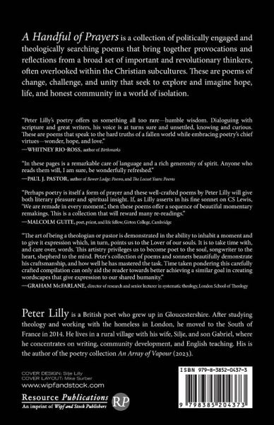 A Handful of Prayers is a collection of politically engaged and theologically searching poems that bring together provocations and reflections from a broad set of important and revolutionary thinkers, often overlooked within the Christian subcultures. These are poems of change, challenge, and unity that seek to explore and imagine hope, life, and honest community in a world of isolation.