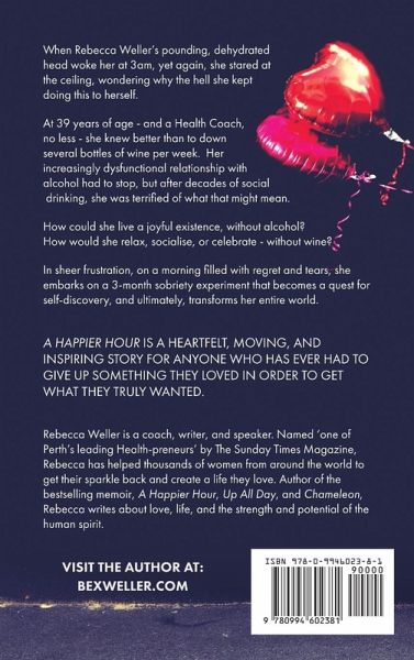 What if the very thing you believed to be your biggest flaw and weakness, actually turned out to be your biggest gift? When Rebecca Weller's pounding, dehydrated head woke her at 3am, yet again, she stared up at the ceiling, wondering why the hell she kept doing this to herself. At 39 years of age - and a Health Coach, no less - she knew better than to down several bottles of wine per week. Her increasingly dysfunctional relationship with alcohol had to stop, but after decades of social drinking, she was terrified of what that might mean. How could she live a joyful existence, without alcohol? How would she relax, socialise, or celebrate - without wine? In sheer frustration, on a morning filled with regret and tears, she embarks on a 3-month sobriety experiment that becomes a quest for self-discovery, and ultimately, transforms her entire world. A Happier Hour is a heartfelt, moving, and inspiring true story for anyone who has ever had to give up something they loved in order to get what they truly wanted.