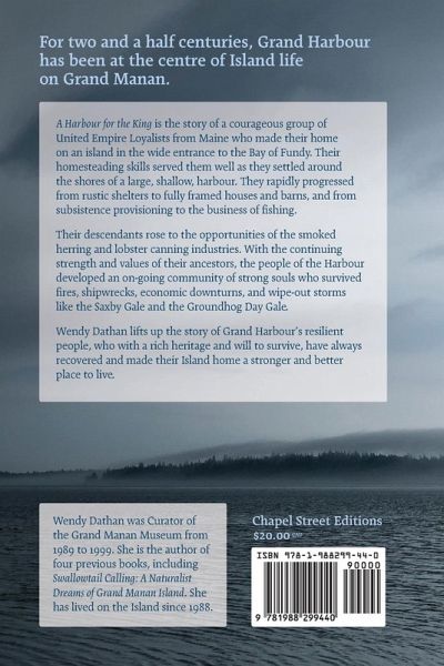 For two and a half centuries, Grand Harbour has been at the centre of Island life on Grand Manan. A Harbour for the King is the story of a courageous group of United Empire Loyalists from Maine who made their home on an island in the wide entrance to the Bay of Fundy. Their homesteading skills served them well as they settled around the shores of a large, shallow, harbour. They rapidly progressed from rustic shelters to fully framed houses and barns, and from subsistence provisioning to the business of fishing. Their descendants rose to the opportunities of the smoked herring and lobster canning industries. With the continuing strength and values of their ancestors, the people of the Harbour developed an on-going community of strong souls who survived fires, shipwrecks, economic downturns, and wipe-out storms like the Saxby Gale and the Groundhog Day Gale. Wendy Dathan lifts up the story of Grand Harbour's resilient people, who with a rich heritage and will to survive, have always recovered and made their Island home a stronger and better place to live.