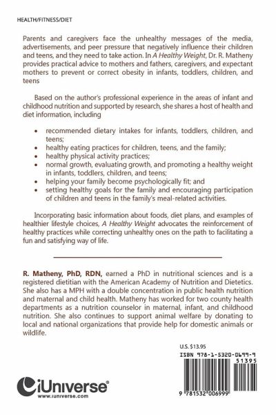 Parents and caregivers face the unhealthy messages of the media, advertisements, and peer pressure that negatively influence their children and teens, and they need to take action. In A Healthy Weight, Dr. R. Matheny provides practical advice to mothers and fathers, caregivers, and expectant mothers to prevent or correct obesity in infants, toddlers, children, and teens Based on the author’s professional experience in the areas of infant and childhood nutrition and supported by research, she shares a host of health and diet information, including • recommended dietary intakes for infants, toddlers, children, and teens; • healthy eating practices for children, teens, and the family; • healthy physical activity practices; • normal growth, evaluating growth, and promoting a healthy weight in infants, toddlers, children, and teens; • helping your family become psychologically fit; and • setting healthy goals for the family and encouraging participation of children and teens in the family’s meal-related activities. Incorporating basic information about foods, diet plans, and examples of healthier lifestyle choices, A Healthy Weight advocates the reinforcement of healthy practices while correcting unhealthy ones on the path to facilitating a fun and satisfying way of life.
