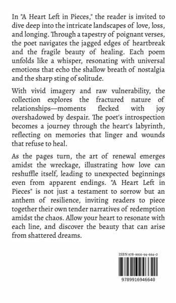 In "A Heart Left in Pieces," the reader is invited to dive deep into the intricate landscapes of love, loss, and longing. Through a tapestry of poignant verses, the poet navigates the jagged edges of heartbreak and the fragile beauty of healing. Each poem unfolds like a whisper, resonating with universal emotions that echo the shallow breath of nostalgia and the sharp sting of solitude. With vivid imagery and raw vulnerability, the collection explores the fractured nature of relationships-moments flecked with joy overshadowed by despair. The poet's introspection becomes a journey through the heart's labyrinth, reflecting on memories that linger and wounds that refuse to heal. As the pages turn, the art of renewal emerges amidst the wreckage, illustrating how love can reshuffle itself, leading to unexpected beginnings even from apparent endings. "A Heart Left in Pieces" is not just a testament to sorrow but an anthem of resilience, inviting readers to piece together their own tender narratives of redemption amidst the chaos. Allow your heart to resonate with each line, and discover the beauty that can arise from shattered dreams.