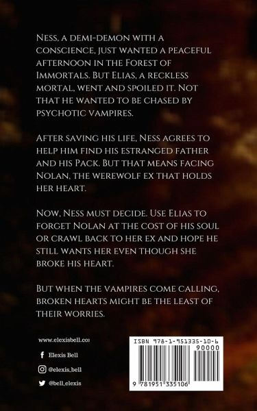 Ness, a demi-demon with a conscience, just wanted a peaceful afternoon in the Forest of Immortals. But Elias, a reckless mortal, went and spoiled it. Not that he wanted to be chased by psychotic vampires. After saving his life, Ness agrees to help him find his estranged father and his Pack. But that means facing Nolan, the werewolf ex that holds her heart. Now, Ness must decide. Use Elias to forget Nolan at the cost of his soul or crawl back to her ex and hope he still wants her even though she broke his heart. But when the vampires come calling, broken hearts might be the least of their worries. Fans of gritty fiction, compelling romance, and imaginative takes on magic and the afterlife will love this dark paranormal high fantasy romance.