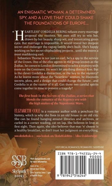 An enigmatic woman, a determined spy, and a design that could shake all of Europe..."Heartless" Cordelia Bering refuses every marriage offer she receives. Yet men still try to win her, drawn by her sharp wit and intoxicating green eyes. But Cordelia knows a marriage could reveal her deepest secret and truly endanger her life. Besides, she hasn't met a man worth considering, until...Sebastien Thorne, a spy in the service of Crown. One of the elite agents in the group known as the Zodiac, he comes to London determined to solve a mystery with roots on the Continent. He won't let anything distract…mehr