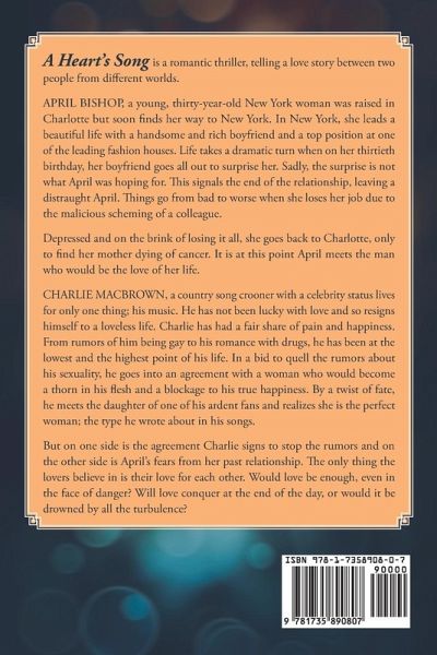 A Heart's Song is a romantic thriller, telling a love story between two people from different worlds. APRIL BISHOP, a young, thirty-year-old New York woman was raised in Charlotte but soon finds her way to New York. In New York, she leads a beautiful life with a handsome and rich boyfriend and a top position at one of the leading fashion houses. Life takes a dramatic turn when on her thirtieth birthday, her boyfriend goes all out to surprise her. Sadly, the surprise is not what April was hoping for. This signals the end of the relationship, leaving a distraught April. Things go from bad to worse when she loses her job due to the malicious scheming of a colleague. Depressed and on the brink of losing it all, she goes back to Charlotte, only to find her mother dying of cancer. It is at this point April meets the man who would be the love of her life. CHARLIE MACBROWN, a country song crooner with a celebrity status lives for only one thing; his music. He has not been lucky with love and so resigns himself to a loveless life. Charlie has had a fair share of pain and happiness. From rumors of him being gay to his romance with drugs, he has been at the lowest and the highest point of his life. In a bid to quell the rumors about his sexuality, he goes into an agreement with a woman who would become a thorn in his flesh and a blockage to his true happiness. By a twist of fate, he meets the daughter of one of his ardent fans and realizes she is the perfect woman; the type he wrote about in his songs. But on one side is the agreement Charlie signs to stop the rumors and on the other side is April's fears from her past relationship. The only thing the lovers believe in is their love for each other. Would love be enough, even in the face of danger? Will love conquer at the end of the day, or would it be drowned by all the turbulence?