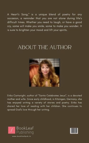 A Heart's Song," is a unique blend of poetry for any occasion, a reminder that you are not alone during life's difficult times. Whether you need to laugh, or have a good cry, some will make you smile, some to make you wonder. It is sure to brighten your mood and lift your spirits.