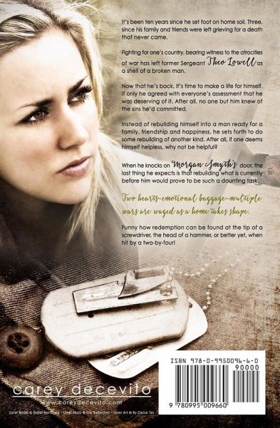It’s been ten years since he set foot on home soil. Three, since his family and friends were left grieving for a death that never came. Fighting for one’s country, bearing witness to the atrocities of war has left former Sergeant Theo Lowell as a shell of a broken man. Now that he’s back, it’s time to make a life for himself. If only he agreed with everyone’s assessment that he was deserving of it. After all, no one but him knew of the sins he’d committed. Instead of rebuilding himself into a man ready for a family, friendship and happiness, he sets forth to do some rebuilding of another kind. After all, if one deems himself helpless, why not be helpful? When he knocks on Morgan Smyth’s door, the last thing he expects is that rebuilding what is currently before him would prove to be such a daunting task. Two hearts—emotional baggage—multiple wars are waged as a home takes shape. Funny how redemption can be found at the tip of a screwdriver, the head of a hammer, or better yet, when hit by a two-by-four!