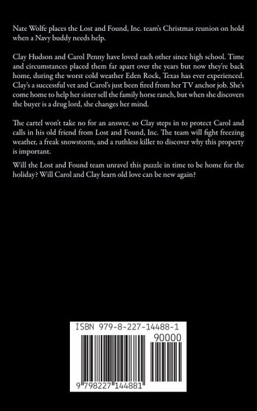 Nate Wolfe places the Lost and Found, Inc. team's Christmas reunion on hold when a Navy buddy needs help. Clay Hudson and Carol Penny have loved each other since high school. Time and circumstances placed them far apart over the years but now they're back home, during the worst cold weather Eden Rock, Texas has ever experienced. Clay's a successful vet and Carol's just been fired from her TV anchor job. She's come home to help her sister sell the family horse ranch, but when she discovers the buyer is a drug lord, she changes her mind. The cartel won't take no for an answer, so Clay steps in to protect Carol and calls in his old friend from Lost and Found, Inc. The team will fight freezing weather, a freak snowstorm, and a ruthless killer to discover why this property is important. Will the Lost and Found team unravel this puzzle in time to be home for the holiday? Will Carol and Clay learn old love can be new again?