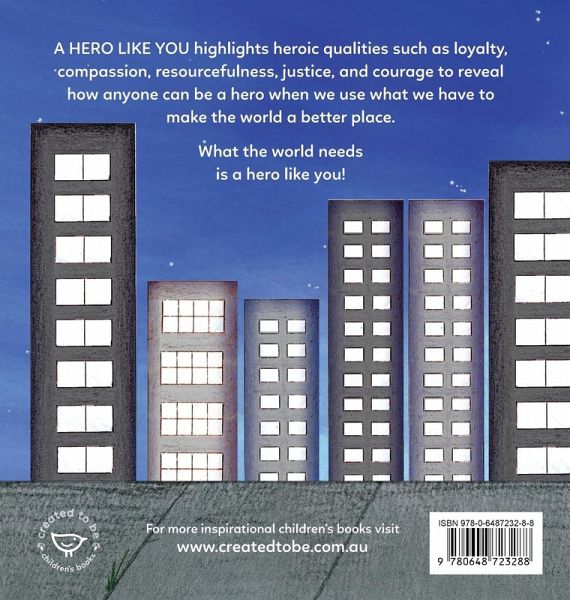 Want to inspire your little hero? Help them discover how anyone can be a hero when we use our talents to make the world a better place. A Hero Like You looks at everyday heroes and highlights qualities such as loyalty, compassion, resourcefulness, justice, and courage. The lyrical rhyme and relatable illustrations remind us that we all have the opportunity to be a hero by helping others, doing right and being the best we can be. "What the world needs is a hero like you!" Recommended for ages 2-8 Find free resources like lesson ideas, videos and colouring sheets at createdtobe.com.au/resources