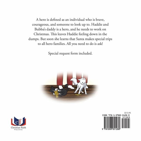 A hero is defined as an individual who is brave, courageous, and someone to look up to. Haddie and Bubba's daddy is a hero, and he needs to work on Christmas. This leaves Haddie feeling down in the dumps. But soon she learns that Santa makes special trips to all hero families. All you need to do is ask! Special request form included.