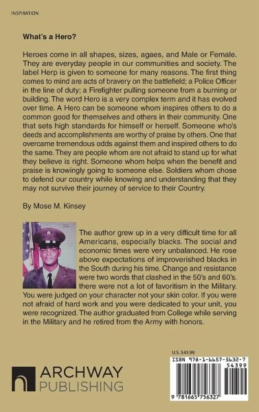What's a Hero? Heroes come in all shapes, sizes, agaes, and Male or Female. They are everyday people in our communities and society. The label Herp is given to someone for many reasons. The first thing comes to mind are acts of bravery on the battlefield; a Police Officer in the line of duty; a Firefighter pulling someone from a burning or building. The word Hero is a very complex term and it has evolved over time. A Hero can be someone whom inspires others to do a common good for themselves and others in their community. One that sets high standards for himself or herself. Someone who's deeds and accomplishments are worthy of praise by others. One that overcame tremendous odds against them and inspired others to do the same. They are people whom are not afraid to stand up for what they believe is right. Someone whom helps when the benefit and praise is knowingly going to someone else. Soldiers whom chose to defend our country while knowing and understanding that they may not survive their journey of service to their Country. By Mose M. Kinsey