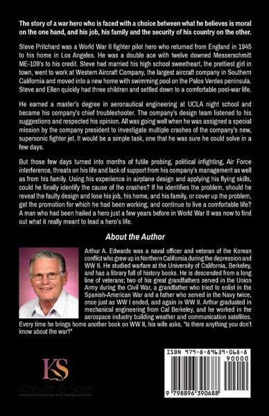 The story of a war hero who is faced with a choice between what he believes is moral on the one hand, and his job, his family and the security of his country on the other. Steve Pritchard was a World War II fighter pilot hero who returned from England in 1945 to his home in Los Angeles. He was a double ace with twelve downed Messerschmitt ME-109's to his credit. Steve had married his high school sweetheart, the prettiest girl in town, went to work at Western Aircraft Company, the largest aircraft company in Southern California and moved into a new home with swimming pool on the Palos Verdes peninsula. Steve and Ellen quickly had three children and settled down to a comfortable post-war life.He earned a master's degree in aeronautical engineering at UCLA night school and became his company's chief troubleshooter. The company's design team listened to his suggestions and respected his opinion. All was going well when he was assigned a special mission by the company president to investigate multiple crashes of the company's new, supersonic fighter jet. It would be a simple task, one that he was sure he could solve in a few days.But those few days turned into months of futile probing, political infighting, Air Force interference, threats on his life and lack of support from his company's management as well as from his family. Using his experience in airplane design and applying his flying skills, could he finally identify the cause of the crashes? If he identifies the problem, should he reveal the faulty design and lose his job, his home, and his family, or cover up the problem, get the promotion for which he had been working, and continue to live a comfortable life? A man who had been hailed a hero just a few years before in World War II was now to find out what it really meant to lead a hero's life.