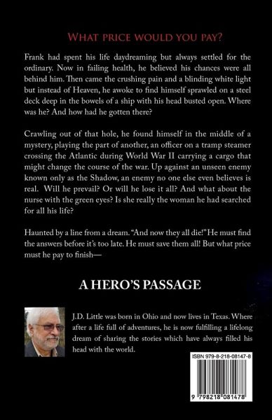 What Price would you pay? Frank had spent his life daydreaming of being the hero but had always settled for the ordinary. Now in failing health, he believed his chances were all behind him. Then came the crushing pain and a blinding white light but instead of Heaven, he awoke to find himself sprawled on a steel deck deep in the bowels of a ship with his head busted open. Where was he? And how had he gotten there? Crawling out of that dark hole, he found himself in the middle of a mystery, playing the part of another, an officer on a tramp steamer crossing the Atlantic during World War II carrying a cargo that might change the course of the war. Up against an unseen enemy known only as the Shadow, an enemy no one else even believes is real. Will he prevail? Or will he lose it all? And what about the pretty nurse with the hypnotic green eyes? Is she really the woman he had searched for all his life? Can he trust her with his secret? Haunted by a line from a dream. "And now they all die!" He must find the answers before it's too late. He must save them all! But what price must he pay to finish-A HERO'S PASSAGE
