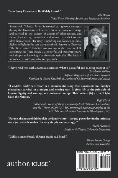 "Your story deserves to be widely heard." —Elie Wiesel, Nobel Prize–winning author and Holocaust survivor ---------------------------------------------------------------- Six-year-old Yolanda Avram is rescued by righteous strangers during the Holocaust in Greece. This is her story of courage and survival in the context of dozens of other rescues and shows Jews saving themselves and others in audacious and often heroic ways. Her story is uplifting and focuses on those flickers of light in the vast darkness of evil, known in Greece as the Persecution. This little-known saga of the common folk outwitting the Third Reich is a powerful and important story, told simply and movingly in cinematic episodes. The book is incandescent with empathy and gratitude. "What a powerful and moving story it is." —Sir Martin Gilbert, official biographer of Winston Churchill, knighted by Queen Elizabeth II, and author of eighty-eight historical books "A Hidden Child in Greece is a monumental story that documents her family’s miraculous survival in a unique and moving way. It gives life to the principle of human dignity and courage as a universal precept . . . this book is a true light unto the nations." —Yaffa Eliach, author and creator of the first university-level Holocaust curriculum and the Tower of Life, a 1,500-photograph permanent display at the US Holocaust Memorial Museum in Washington, DC "Willis is Anne Frank, if Anne Frank had lived." —Diana Hume George, author and educator "For me, the heart of this book is the family story—the real power lays in the intimate story you are able to describe very simply and movingly." —Mark Mazower, director, modern European history, Columbia University