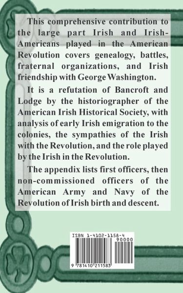This comprehensive contribution to the large part Irish and Irish-Americans played in the American Revolution covers genealogy, battles, fraternal organizations, and Irish friendship with George Washington. It is a refutation of Bancroft and Lodge by the historiographer of the American Irish Historical Society, with analysis of early Irish emigration to the colonies, the sympathies of the Irish with the Revolution, and the role played by the Irish in the Revolution. The appendix lists first officers, then non-commissioned officers of the American Army and Navy of the Revolution of Irish birth and descent.
