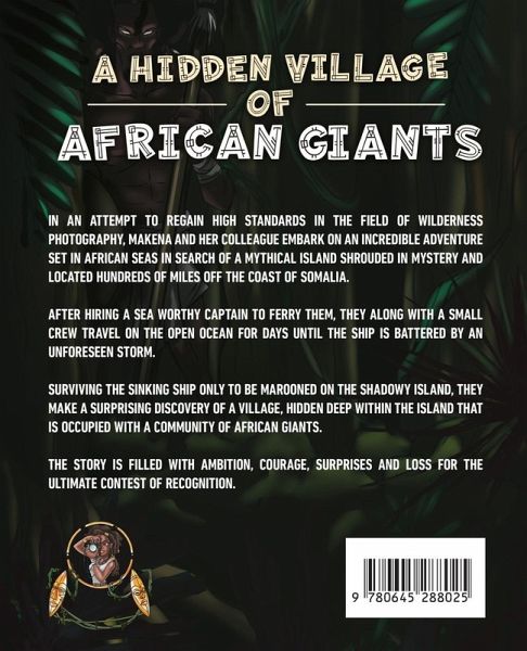 "In an attempt to regain high standards in the field of wilderness photography, Makena and her colleague embark on an incredible adventure set in African seas in search of a mythical island shrouded in mystery and located hundreds of miles off the coast of Somalia. After hiring a sea worthy captain to ferry them, they along with a small crew travel on the open ocean for days until the ship is battered by an unforeseen storm. Surviving the sinking ship only to be marooned on the shadowy island, they make a surprising discovery of a village hidden deep within the island that is occupied with a community of African giants. The story is filled with ambition, courage, surprises and loss for the ultimate contest of recognition."
