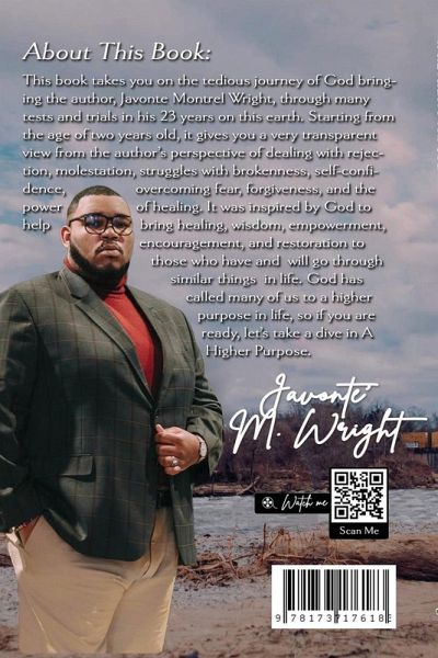 This book takes you on the tedious journey of God bringing the author, Javonte Montrel Wright, through many tests and trials in his 23 years on this earth. Starting from the age of two years old, it gives you a very transparent view from the author's perspective of dealing with rejection, molestation, struggles with brokenness, self-confidence, overcoming fear, forgiveness, and the power of healing. It was inspired by God to help bring healing, wisdom, empowerment, encouragement, and restoration to those who have and will go through similar things in life. God has called many of us to a higher purpose in life, so if you are ready, let's take a dive into A Higher Purpose.