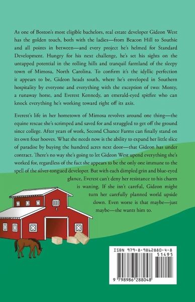As one of Boston's most eligible bachelors, real estate developer Gideon West has the golden touch, both with the ladies-from Beacon Hill to Southie and all points in between-and every project he's helmed for Standard Development. Hungry for his next challenge, he's set his sights on the untapped potential in the rolling hills and tranquil farmland of the sleepy town of Mimosa, North Carolina. To confirm it's the idyllic perfection it appears to be, Gideon heads south, where he's enveloped in Southern hospitality by everyone and everything with the exception of two: Monty, a runaway horse, and Everest Kennedy, an emerald-eyed spitfire who can knock everything he's working toward right on its axis. Everest's life in her hometown of Mimosa revolves around one thing-the equine rescue she's scrimped and saved for and struggled to get off the ground since college. After years of work, Second Chance Farms can finally stand on its own four hooves. What she needs now is the ability to expand her little slice of paradise by buying the hundred acres next door-that Gideon has under contract. There's no way she's going to let Gideon West upend everything she's worked for,¿regardless of the fact she appears to be the only one immune to the spell of the silver-tongued developer. But with each dimpled grin and blue-eyed glance, Everest can't deny her resistance to his charm is waning. If she isn't careful, Gideon might turn her carefully planned world upside down. Even worse is that maybe - just maybe - she wants him to.