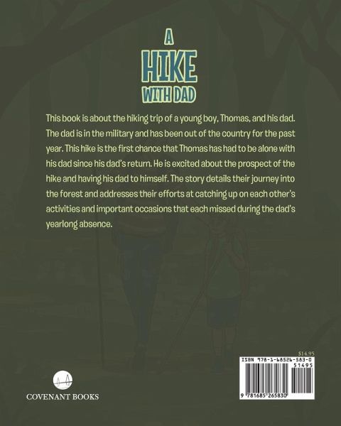 This book is about the hiking trip of a young boy, Thomas, and his dad. The dad is in the military and has been out of the country for the past year. This hike is the first chance that Thomas has had to be alone with his dad since his dad's return. He is excited about the prospect of the hike and having his dad to himself. The story details their journey into the forest and addresses their efforts at catching up on each other's activities and important occasions that each missed during the dad's yearlong absence.