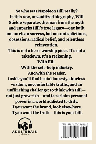 Napoleon Hill's Think and Grow Rich launched a movement, built empires, and shaped the modern self-help industry. But behind the polished philosophy was a life of contradictions: vanished ventures, contested origin stories, accusations of fraud, and conversations with ghosts. A Hill to Die On is the unauthorized, unfiltered biography that dares to tell the full story. Written with edge, clarity, and zero reverence, Will Stickle peels back the curated image and examines Hill's real legacy-not just what he taught, but how he thought, how he failed, and why his work still holds power today. You'll discover:The true origins-and controversies-behind Think and Grow Rich The suppressed manuscript that revealed Hill's inner war His influence on Robbins, Proctor, Byrne, and the rise of spiritual capitalism The dark side of belief, guru culture, and blind faith What still makes Hill's principles dangerous-and essential More than a biography, this book is a firestarter for thinkers, builders, skeptics, and seekers who are done with hype and ready for the hard truth: success doesn't start with a quote. It starts with a decision.