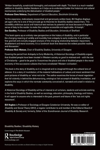 Covering the period from Antiquity to Early Modernity, A Historical Sociology of Disability argues that disabled people have been treated in Western society as good to mistreat and - with the rise of Christianity - good to be good to. It examines the place and role of disabled people in the moral economy of the successive cultures that have constituted 'Western civilisation'. This book is the story of disability as it is imagined and re-imagined through the cultural lens of ableism. It is a story of invalidation; of the material habituations of culture and moral sentiment that paint pictures of disability as 'what not to be'. The author examines the forces of moral regulation that fall violently in behind the dehumanising, ontological fait accompli of disability invalidation, and explores the ways in which the normate community conceived of, narrated and acted in relation to disability. A Historical Sociology of Disability will be of interest to all scholars, students and activists working in the field of Disability Studies, as well as sociology, education, philosophy, theology and history. It will appeal to anyone who is interested in the past, present and future of the 'last civil rights movement'.