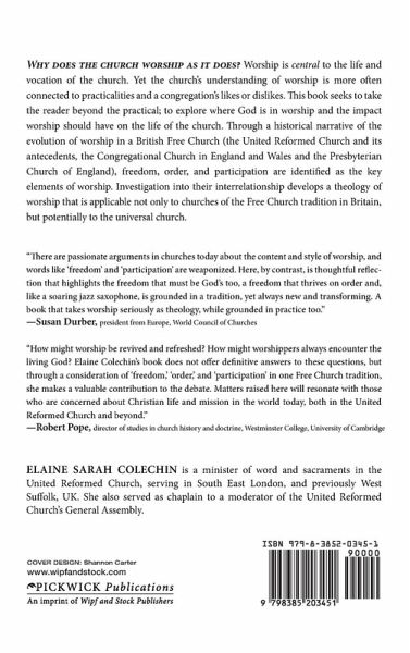 Why does the church worship as it does? Worship is central to the life and vocation of the church. Yet the church's understanding of worship is more often connected to practicalities and a congregation's likes or dislikes. This book seeks to take the reader beyond the practical; to explore where God is in worship and the impact worship should have on the life of the church. Through a historical narrative of the evolution of worship in a British Free Church (the United Reformed Church and its antecedents, the Congregational Church in England and Wales and the Presbyterian Church of England), freedom, order, and participation are identified as the key elements of worship. Investigation into their interrelationship develops a theology of worship that is applicable not only to churches of the Free Church tradition in Britain, but potentially to the universal church.
