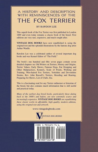 This superb book of the Fox Terrier was first published in London 1889 and even today remains a classic book of the breed. First editions are very rare, expensive, and much sought after. Vintage Dog Books have now republished it, using the original text and the splendid illustrations by the famous dog artist Arthur Wardle. Rawdon Lee was a celebrated author of several important dog books and was Kennel Editor of "The Field." The books one hundred and fifty-seven pages contain seven detailed chapters on: Old Writers on Terriers. History and Origins. Terrier Values. Early Shows. Famous Dogs. Ear Dropping and Other Malpractices. Kennels. Scale of Points. Working and Training. Wire-haired Fox Terriers. Yorkshire and Devonshire Strains. Rev. John Russell's Terriers. Breeding and Rearing. Preparing for Shows. List of Clubs. Etc. This is a fascinating read for any Terrier enthusiast or historian of the breed, but also contains much information that is still useful and practical today. Many of the earliest books, particularly those dating back to the 1900s and before, are now extremely scarce and increasingly expensive. We are republishing many of these classic works in affordable, high quality, modern editions, using the original text and artwork.