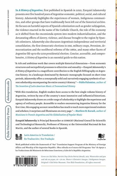 In A History of Argentina, originally published in Spanish in 2020, Ezequiel Adamovsky presents over five hundred years of Argentine economic, political, social, and cultural history. Adamovsky highlights the experiences of women, Indigenous communities, and other groups that have traditionally been left out of the historical archive. He focuses on harmful aspects of Spanish colonization such as gender subjugation, the violence enacted in the name of the Catholic Church, the role of the economy as it shifted from the encomienda system into modern industrialization, and the devastating effects of slavery, violence, and disease brought to the region by Spanish colonizers. Adamovsky also discusses Argentina's independence and territorial consolidation, the first democratic elections in 1916, military coups, Peronism, democratization and the neoliberal reforms of the 1980s, and many other facets of Argentine life up to the 2019 presidential election. Concise, accessible, and comprehensive, A History of Argentina is an essential guide to this nation.