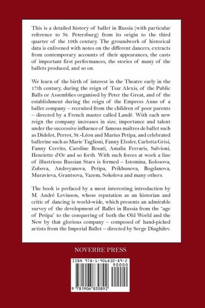 This is a detailed history of ballet in Russia (with particular reference to St. Petersburg) from its origin to the third quarter of the 19th century. The groundwork of historical data is enlivened with notes on the different dancers, extracts from contemporary accounts of their appearances, the casts of important first performances, the stories of many of the ballets produced, and so on. We learn of the birth of interest in the Theatre early in the 17th century, during the reign of Tsar Alexis, of the Public Balls or Assemblies organised by Peter the Great, and of the establishment during the reign of the Empress Anne of a ballet company - recruited from the children of poor parents - directed by a French master called Landé. With each new reign the company increases in size, importance and talent under the successive influence of famous maîtres de ballet such as Didelot, Perrot, St.-Léon and Marius Petipa, and celebrated ballerine such as Marie Taglioni, Fanny Elssler, Carlotta Grisi, Fanny Cerrito, Caroline Rosati, Amalia Ferraris, Salvioni, Henriette d'Or and so forth. With such forces at work a line of illustrious Russian Stars is formed - Istomina, Kolosova, Zubova, Andreyanova, Petipa, Prikhunova, Bogdanova, Muravieva, Grantsova, Vazem, Sokolova and many others. The book is prefaced by a most interesting introduction by M. André Levinson, whose reputation as an historian and critic of dancing is world-wide, which presents an admirable survey of the development of Ballet in Russia from the "age of Petipa" to the conquering of both the Old World and the New by that glorious company - composed of hand-picked artists from the Imperial Ballet - directed by Serge Diaghilev.