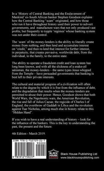 In a ‘History of Central Banking and the Enslavement of Mankind’ ex-South African banker Stephen Goodson explains how the Central Banking "scam" originated, and how those who run it have throughout history used their power to subvert governments, and manufacture wars that not only produced vast profits, but frequently to topple ‘regimes’ whose banking system was not under their control. The ‘scam’ of the money-lenders is the ability to literally create money from nothing, and then lend and accumulate interest on "credit," and then re-lend that interest for further interest, in perpetuity, that creates pervasive, worldwide debt, from the individual, to the family, to the entire state. The ability to operate a fraudulent credit and loan system has long been known, and with all the slickness of a snake-oil salesman, the money-lenders – the same types Jesus whipped from the Temple – have persuaded governments that banking is best left to their private interests. The cultural and material progress of a civilization will often relate to the degree by which it is free from the influence of debt, and the degradation that results when the money-lenders are permitted to abuse their power. Hence, Goodson shows that both World Wars, the Napoleonic wars, the American Revolution, the rise and fall of Julius Caesar, the regicide of Charles I of England, the overthrow of Gaddafi in Libya and the revolution against Tsar Nicholas, among much else in history relate to this "Hidden Hand". If you wish to have a real understanding of history – look for the influence of the bankers. This is the key to understanding the past, the present and the future. 4th Edition - March 2019.
