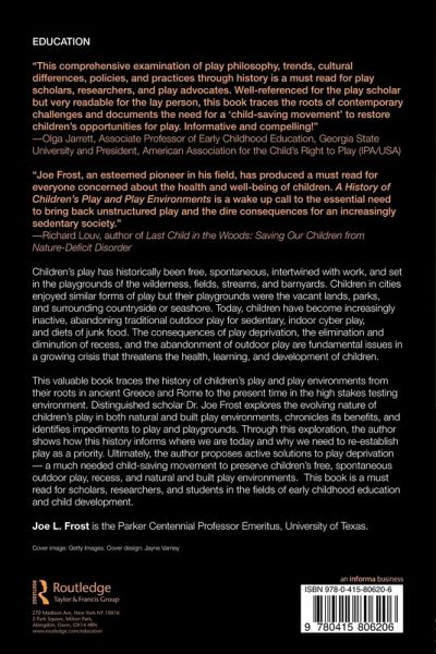 Children's play throughout history has been free, spontaneous, and intertwined with work, set in the playgrounds of the fields, streams, and barnyards. Children in cities enjoyed similar forms of play but their playgrounds were the vacant lands and parks. Today, children have become increasingly inactive, abandoning traditional outdoor play for sedentary, indoor cyber play and poor diets. The consequences of play deprivation, the elimination and diminution of recess, and the abandonment of outdoor play are fundamental issues in a growing crisis that threatens the health, development, and welfare of children. This valuable book traces the history of children's play and play environments from their roots in ancient Greece and Rome to the present time in the high stakes testing environment. Through this exploration, scholar Dr. Joe Frost shows how this history informs where we are today and why we need to re-establish play as a priority. Ultimately, the author proposes active solutions to play deprivation. This book is a must-read for scholars, researchers, and students in the fields of early childhood education and child development.