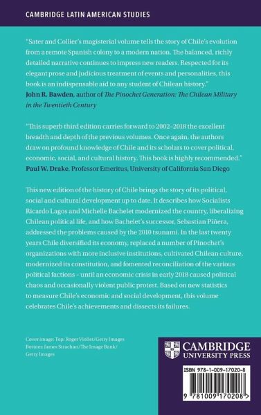 Part I. Birth of a nation state, 1800s 1830s: 1. Colonial foundations, 1540 1810; 2. Independence, 1808 30; 3. The conservative settlement, 1830 41; Part II. The rise of a republic, 1830s 1880s: 4. A time of progress, 1830s 1870s; 5. The liberal impulse, 1841 76; 6. Crisis and war, 1876 83; Part III. The nitrate era, 1880s 1930s: 7. The Parliamentary period, 1882 1920; 8. The Lion and the Mule, 1920 38; Part IV. Industrial advance and the dawn of mass politics, 1930s 1960s: 9. The radicals, the general of hope, and the Lion's Son, 1938 64; 10. The industrial impulse, 1930s 1960s; Part V. Democracy and dictatorship, 1960s 2000s: 11. Revolution in liberty, 1964 70; 12. The Chilean road to socialism, 1970 73; 13. The Pinochet years; 14. Re encounter with history, 1990 2002; 15. Adapting to the twenty first century 2002 2018.