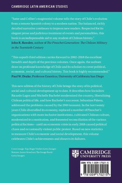 Part I. Birth of a nation state, 1800s 1830s: 1. Colonial foundations, 1540 1810; 2. Independence, 1808 30; 3. The conservative settlement, 1830 41; Part II. The rise of a republic, 1830s 1880s: 4. A time of progress, 1830s 1870s; 5. The liberal impulse, 1841 76; 6. Crisis and war, 1876 83; Part III. The nitrate era, 1880s 1930s: 7. The Parliamentary period, 1882 1920; 8. The Lion and the Mule, 1920 38; Part IV. Industrial advance and the dawn of mass politics, 1930s 1960s: 9. The radicals, the general of hope, and the Lion's Son, 1938 64; 10. The industrial impulse, 1930s 1960s; Part V. Democracy and dictatorship, 1960s 2000s: 11. Revolution in liberty, 1964 70; 12. The Chilean road to socialism, 1970 73; 13. The Pinochet years; 14. Re encounter with history, 1990 2002; 15. Adapting to the twenty first century 2002 2018.
