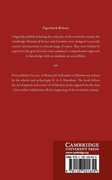 Originally published during the early part of the twentieth century, the Cambridge Manuals of Science and Literature were designed to provide concise introductions to a broad range of topics. They were written by experts for the general reader and combined a comprehensive approach to knowledge with an emphasis on accessibility. First published in 1912, A History of Civilization in Palestine was written by the scholar and archeologist R. A. S. Macalister. The book follows the development and course of civilization in the region from the time of its earliest inhabitancy till the beginning of the twentieth century.