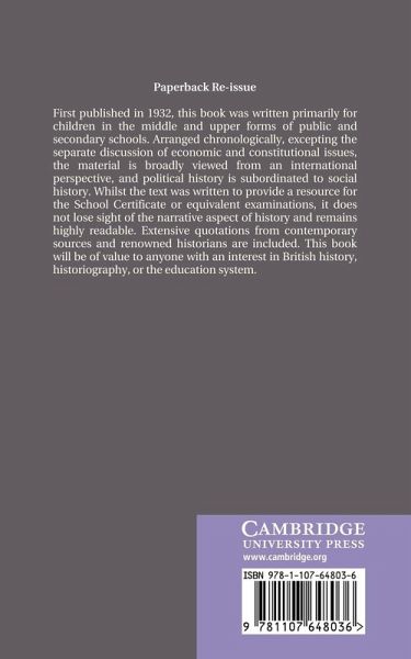 First published in 1932, this book was written primarily for children in the middle and upper forms of public and secondary schools. Arranged chronologically, excepting the separate discussion of economic and constitutional issues, the material is broadly viewed from an international perspective, and political history is subordinated to social history. Whilst the text was written to provide a resource for the School Certificate or equivalent examinations, it does not lose sight of the narrative aspect of history and remains highly readable. Extensive quotations from contemporary sources and renowned historians are included. This book will be of value to anyone with an interest in British history, historiography, or the education system.