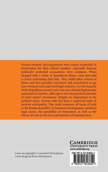 Roman senators and equestrians were always vulnerable to prosecution for their official conduct, especially since politically motivated accusations were common. When charged with a crime in Republican Rome, such men had a choice concerning their fate. They could either remain in Rome and face possible conviction and punishment, or go into voluntary exile and avoid legal sentence. For the majority of the Republican period, exile was not a formal legal penalty contained in statutes, although it was the practical outcome of most capital convictions. Despite its importance in the political arena, Roman exile has been a neglected topic in modern scholarship. This 2006 study examines all facets of exile in the Roman Republic: its historical development, technical legal issues, the possibility of restoration, as well as the effects of exile on the lives and families of banished men.