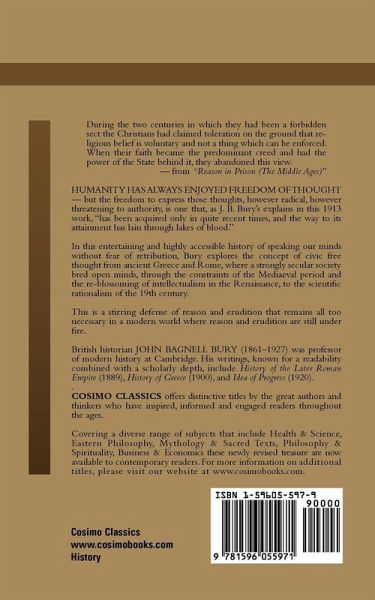 During the two centuries in which they had been a forbidden sect the Christians had claimed toleration on the ground that religious belief is voluntary and not a thing which can be enforced. When their faith became the predominant creed and had the power of the State behind it, they abandoned this view. -from "Reason in Prison (The Middle Ages)" Humanity has always enjoyed freedom of thought-but the freedom to express those thoughts, however radical, however threatening to authority, is one that, as J. B. Bury's explains in this 1913 work, "has been acquired only in quite recent times, and the way to its attainment has lain through lakes of blood." In this entertaining and highly accessible history of speaking our minds without fear of retribution, Bury explores the concept of civic free thought from ancient Greece and Rome, where a strongly secular society bred open minds, through the constraints of the Mediaeval period and the re-blossoming of intellectualism in the Renaissance, to the scientific rationalism of the 19th century. This is a stirring defense of reason and erudition that remains all too necessary in a modern world where reason and erudition are still under fire. British historian JOHN BAGNELL BURY (1861-1927) was professor of modern history at Cambridge. His writings, known for a readability combined with a scholarly depth, include History of the Later Roman Empire (1889), History of Greece (1900), and Idea of Progress (1920).