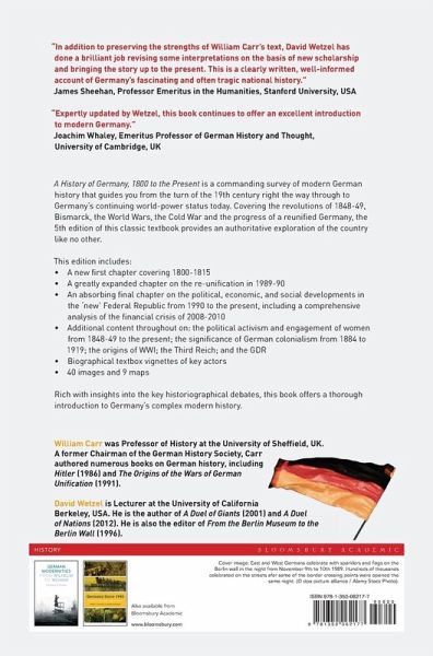 A History of Germany, 1800 to the Present is a commanding survey of modern German history that guides you from the turn of the 19th century right the way through to Germany's continuing world-power status today. Covering the revolutions of 1848-49, Bismarck, the World Wars, the Cold War and the progress of a reunified Germany, the 5th edition of this classic textbook provides an authoritative exploration of the country across the whole period like no other. This edition includes: * A new first chapter covering 1800-1815 * A greatly expanded chapter on the re-unification in 1989-90 * An absorbing final chapter on the political, economic, and social developments in the 'new' Federal Republic from 1990 to the present, including a comprehensive analysis of the financial crisis of 2008-2010 * Additional content throughout on: the political activism and engagement of women from 1848-49 to the present; the significance of German colonialism from 1884 to 1919; the origins of WWI; the Third Reich; and the GDR * Biographical textbox vignettes of key actors * For the first time, 40 images and 9 maps Rich with insights into the key historiographical debates, this book offers a thorough introduction to Germany's complex modern history.