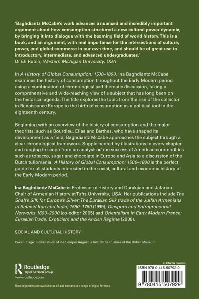 Beginning with an overview of the history of consumption and the major theorists, such as Bourdieu, Elias and Barthes, who have shaped its development as a field, Baghdiantz McCabe approaches the subject through a clear chronological framework. Supplemented by illlustrations in every chapter and ranging in scope from an analysis of the success of American commodities such as tobacco, sugar and chocolate in Europe and Asia to a discussion of the Dutch tulip mania, A History of Global Consumption: 1500 - 1800 is the perfect guide for all students interested in the social, cultural and economic history of the early modern period.